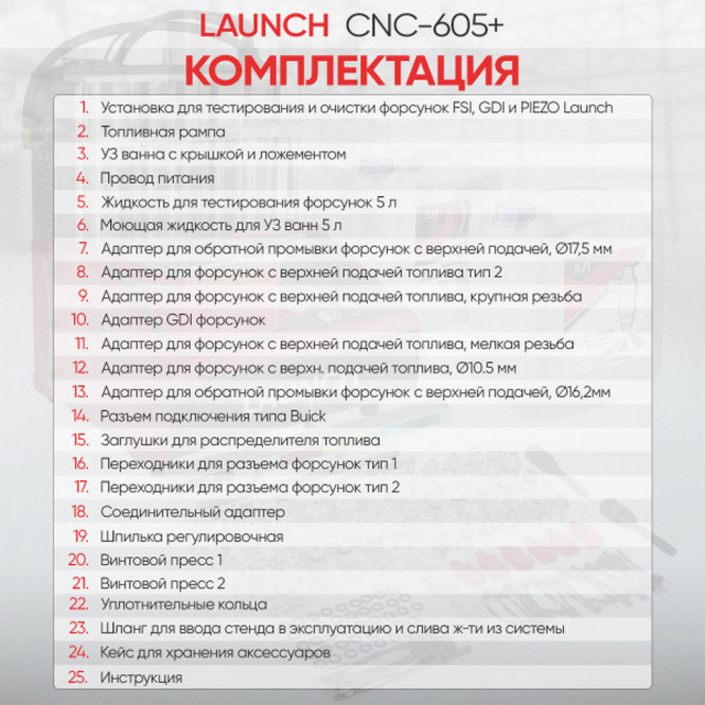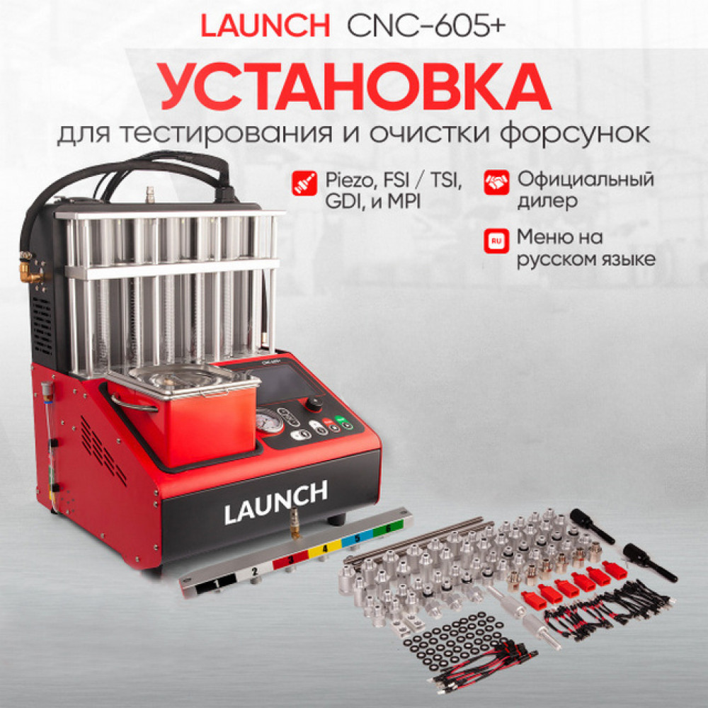 Launch CNC-605+ — это современный многофункциональный стенд, предназначенный для комплексной проверки и обслуживания бензиновых форсунок. Установка объединяет в себе возможности точной диагностики, имитации работы двигателя и ультразвуковой очистки, что позволяет эффективно выявлять неисправности и восстанавливать работоспособность топливной системы.